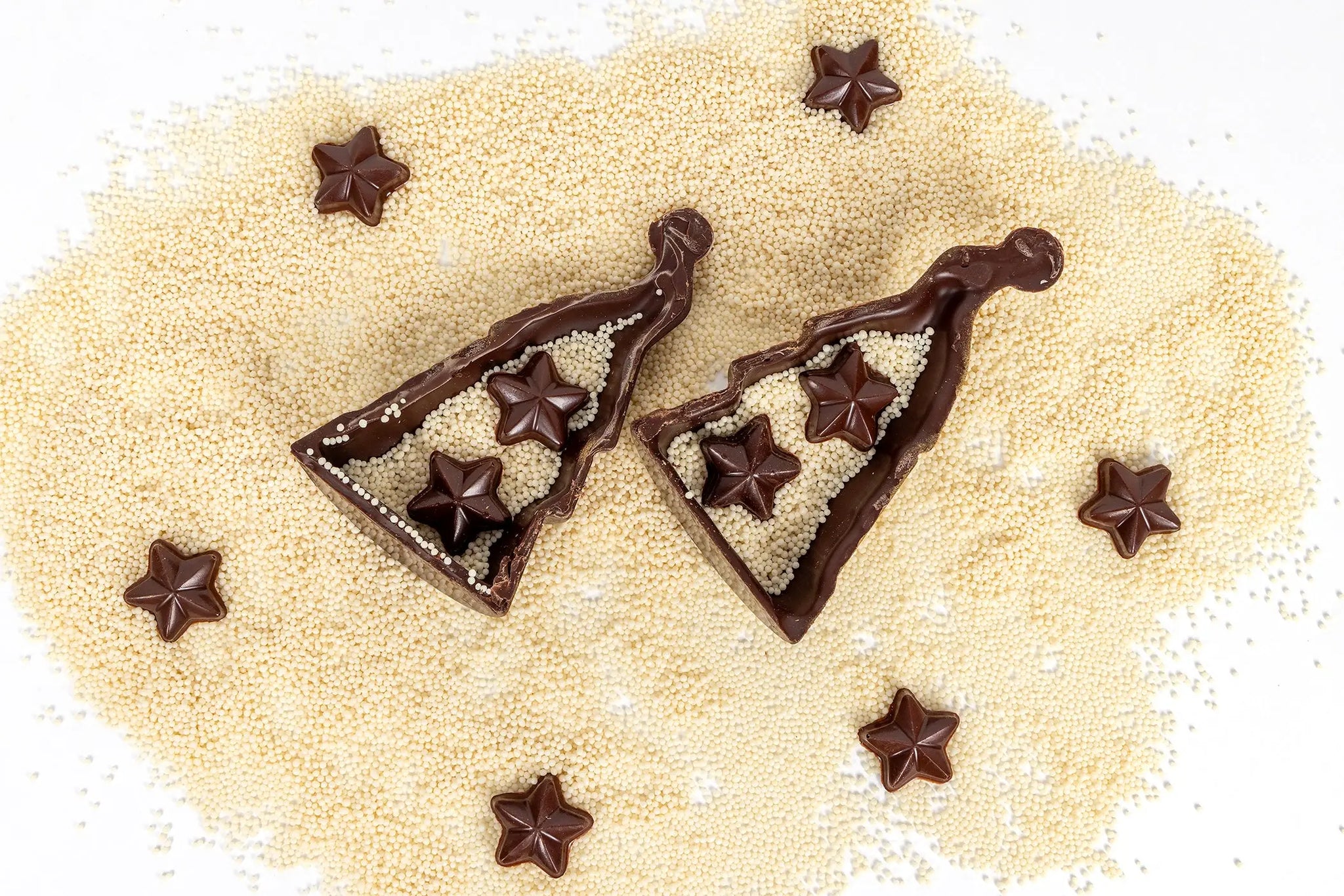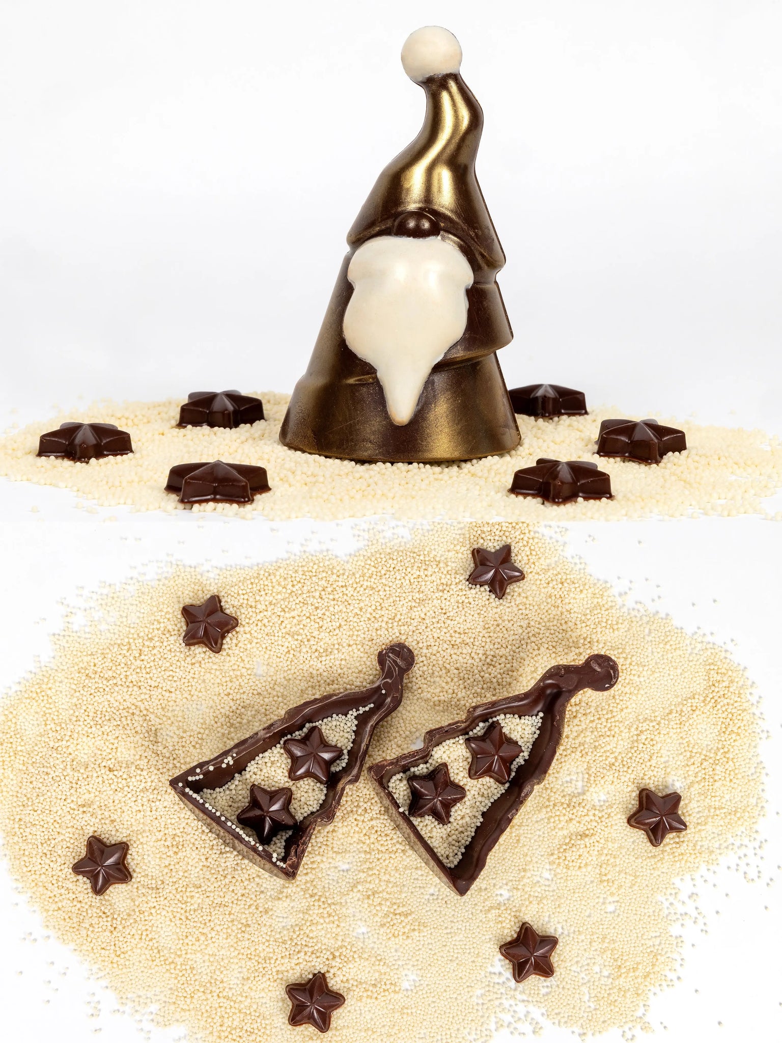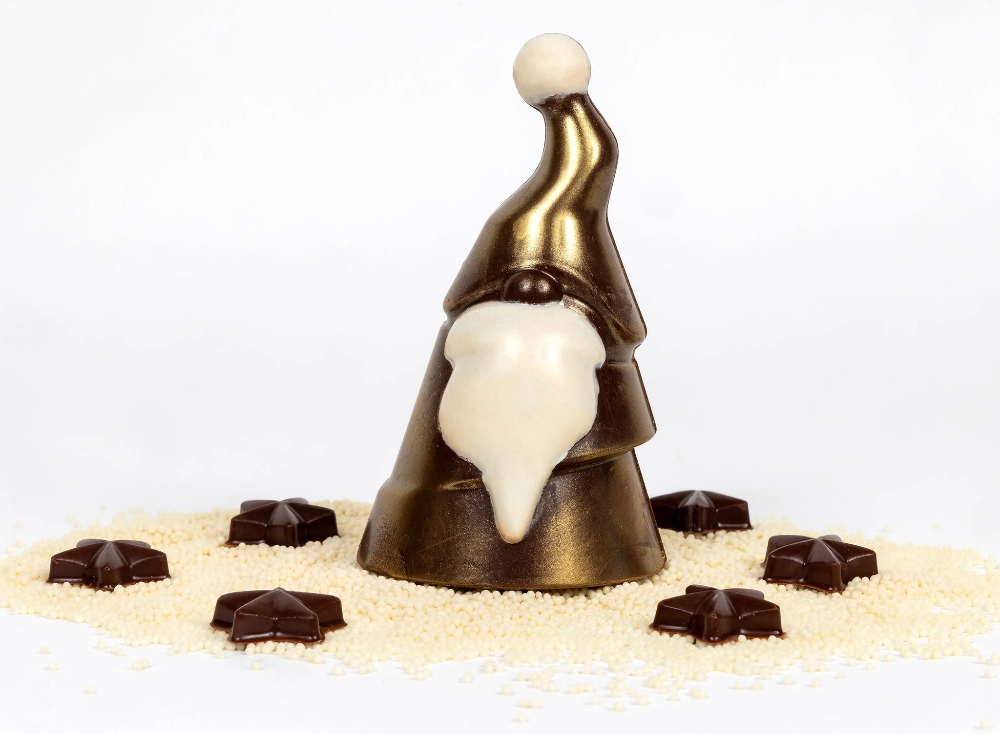 Give him a gentle break to reveal a snowfall of crisp white nonpareils, cascading out like fresh winter snow. Nestled within are velvety chocolate stars, adding a playful touch and a burst of extra indulgence to every bite.